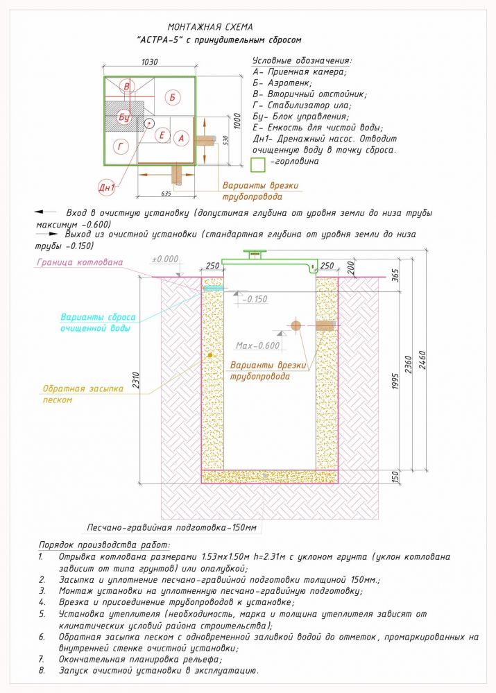 • При формировании котлована его размеры должны быть больше габаритов станции, а дно требуется засыпать слоем песка свыше 15 см, который должен быть выровнен относительно горизонта.